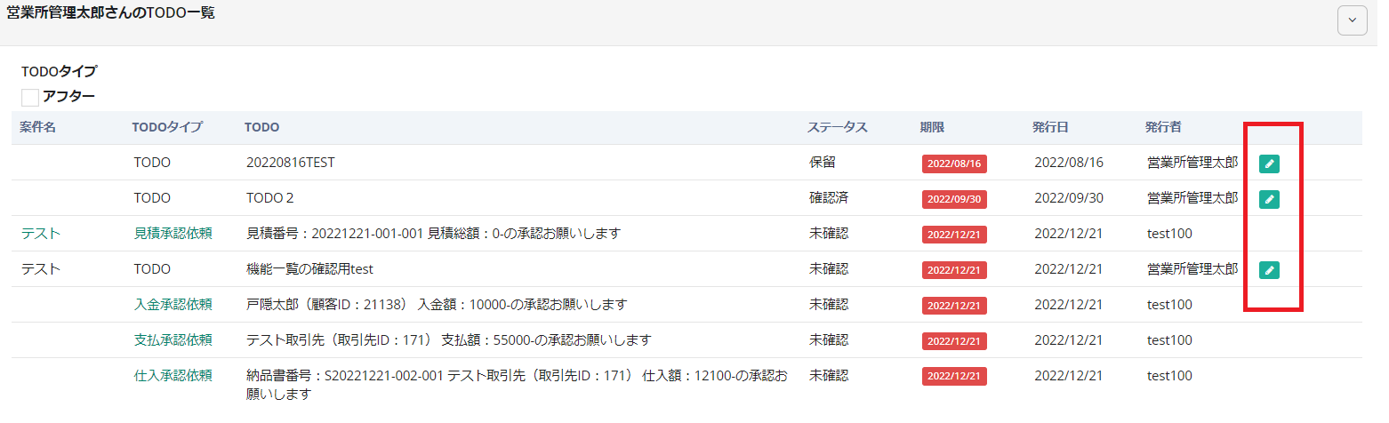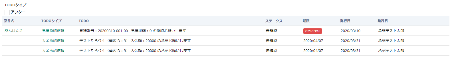 2)各画面で承認依頼を行うと、依頼先・発行者ともにTODOステータスが完了となり、非表示になります。