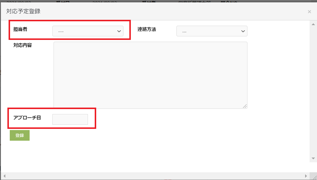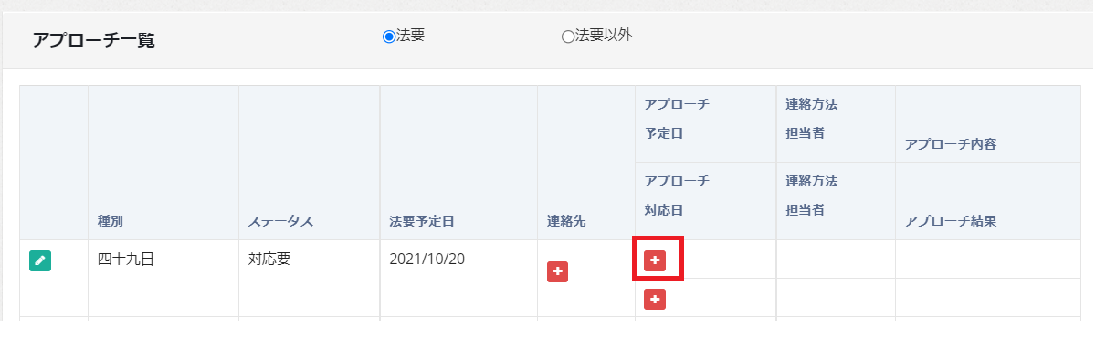 3)アプローチアプローチ予定を登録するには アフター画面で以下画像の+ボタンを押下してください 対応予定登録モーダルが表示されるので、アプローチ予定を入力します。 この担当者欄に指定したユーザでログインし、ダッシュボードへアクセスするとアプローチ予定の内容がTODO一覧へ表示されます。