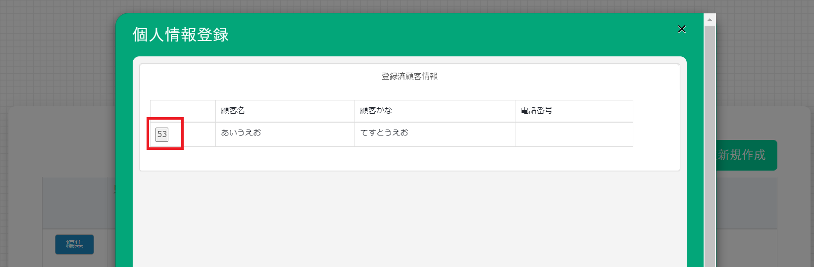 1)押下すると個人情報登録モーダルの登録済顧客情報タブが表示されます。