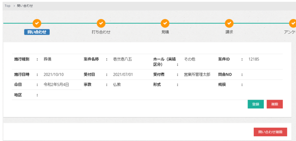 2)施行日、葬儀形式、葬儀規模については案件情報を参照して表示しているため、打ち合えせ削除後も表示は残ったままとなるのが仕様となります。